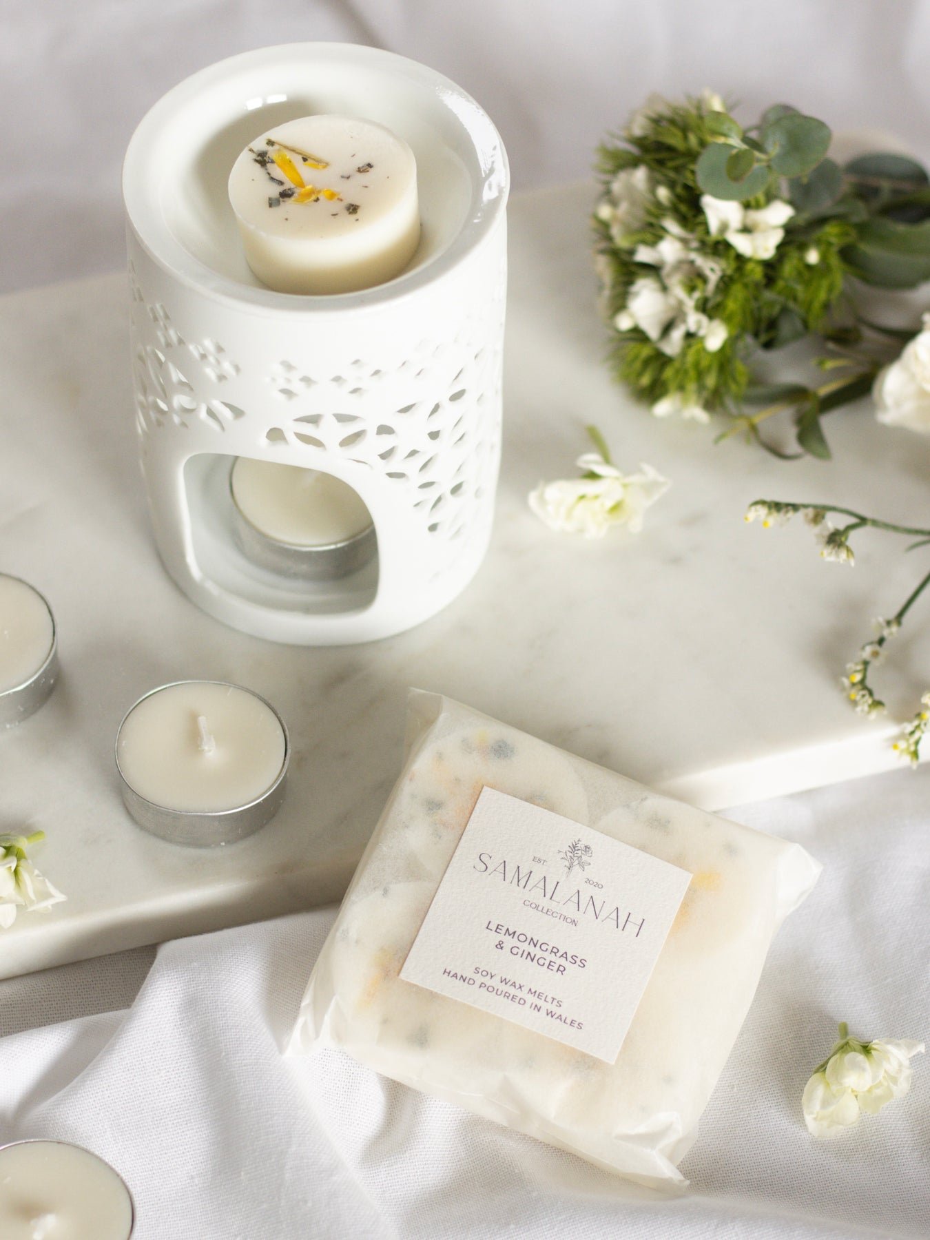 Place one Samalanah wax melt in the top of your wax melt burner. Light a small, unscented 4 hour tea light underneath. The wax will warm up and fill your home with beautiful fragrance.