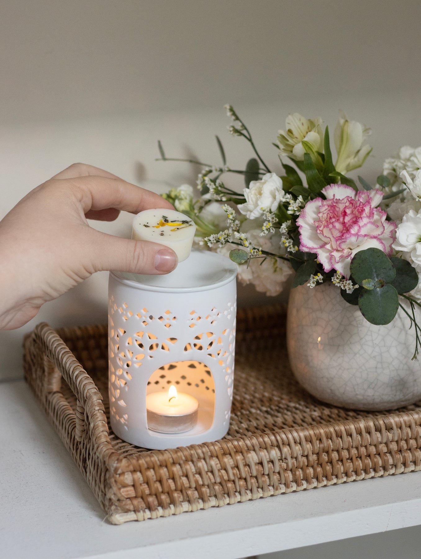To replace your wax melt, simply light a tea light inside your burner for 30-60 seconds and gently apply pressure on the edge of the wax until it pops out.
